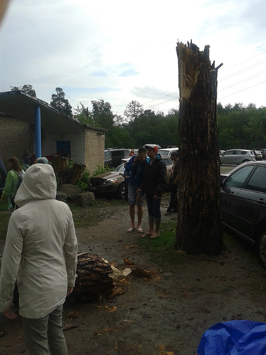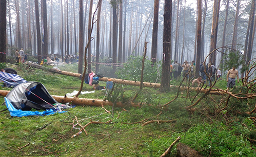 В субботу, 14 июня, в 17.55 территорию фестиваля накрыл грозовой фронт. Стихия обрушилась внезапно и длилась всего семь минут. Порывы ветра были настолько сильными, что деревья начали падать прямо на палаточный лагерь.