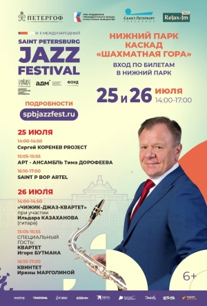 На открытой сцене у каскада «Шахматная гора» выступят Сергей Коренев PROJECT, АРТ — АНСАМБЛЬ ТИМА ДОРОФЕЕВА, Saint P Bop Artel, «Чижик-Джаз-Квартет» при участии Ильдара Казаханова (гитара), Квинтет Ирины Марголиной.