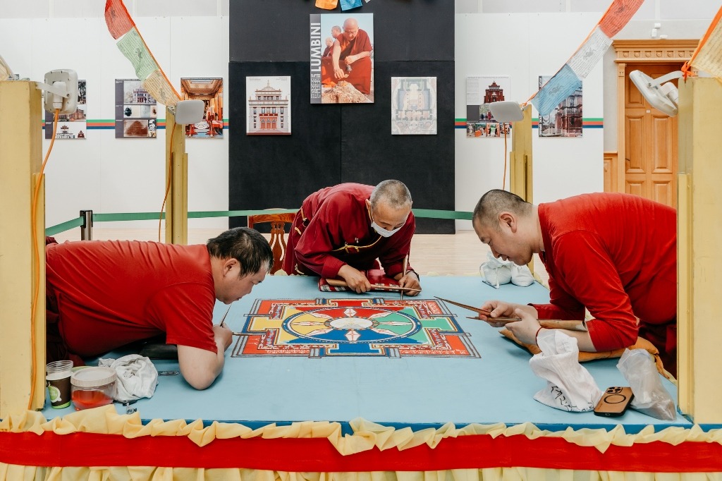 Здесь же, на выставке, в июле этого года ламы Дацана Гунзэчойнэй впервые в Петербурге построили мандалу Ваджрасаттвы. Буддийская песочная мандала – это ритуальный ковёр из мелких фрагментов разноцветных минералов, который представляет собой плоскостную проекцию Дворца буддийского божества. Дворец каждого бодхисаттвы или божества имеет свою архитектуру – соответственно, каждая мандала имеет свою геометрию и цветовой рисунок. Это кропотливый и искусный труд, доступный только ламам, специализирующимся в этом виде культового искусства.
