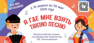 С 15 апреля по 20 мая 2026 года в рамках межведомственного культурно-образовательного проекта «Культура для школьников» пройдет всероссийская акция «А где мне взять такую песню», посвященная творчеству Народного артиста СССР, композитора Григория Пономаренко.