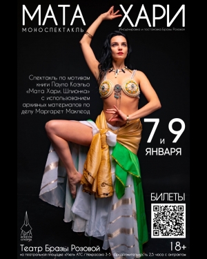 7 и 9 января на моноспектакль «Мата Хари», придя на который Вы: будете до глубины души тронуты историей жизни героини, почувствуете всю гамму чувств, которые пережила Мата Хари будите свидетелями того, как я пропускаю всё через себя и на сцене оживает настоящая Мата Хари