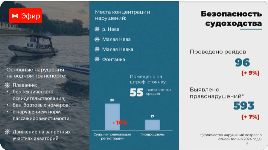 Число выявленных правонарушений на водном транспорте Санкт-Петербурга в 2025 году выросло на 7% в сравнении с предыдущим годом и достигло 593 единиц.