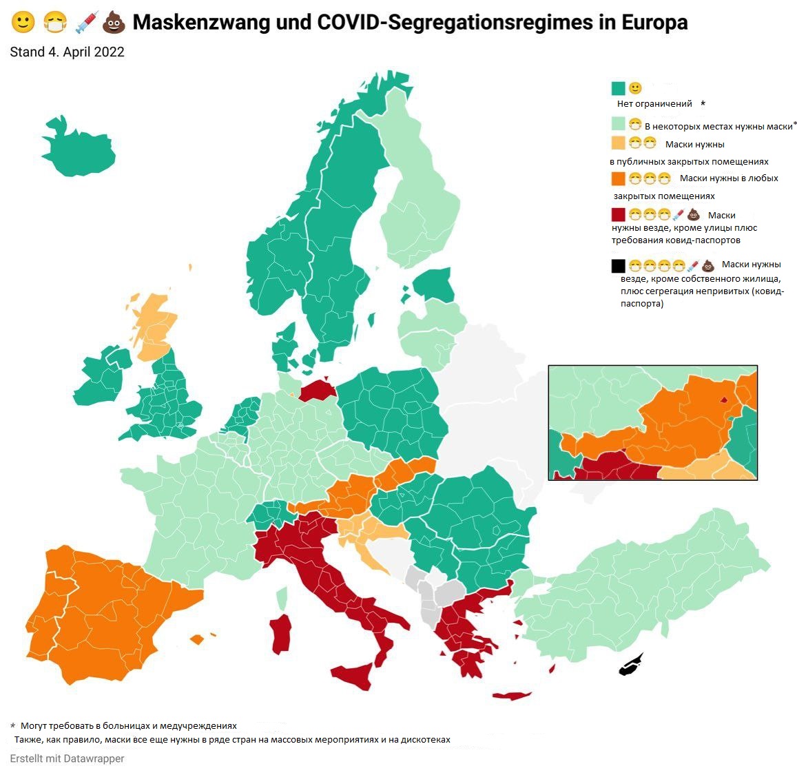 Довольно наглядно видно по карте, какие страны ЕС держатся за ковидные ограничения наиболее стойко, а какие решили что ковид для них больше не опасен. Конечно, будут и еще изменения, но уже понятно, от какой стадии они будут.