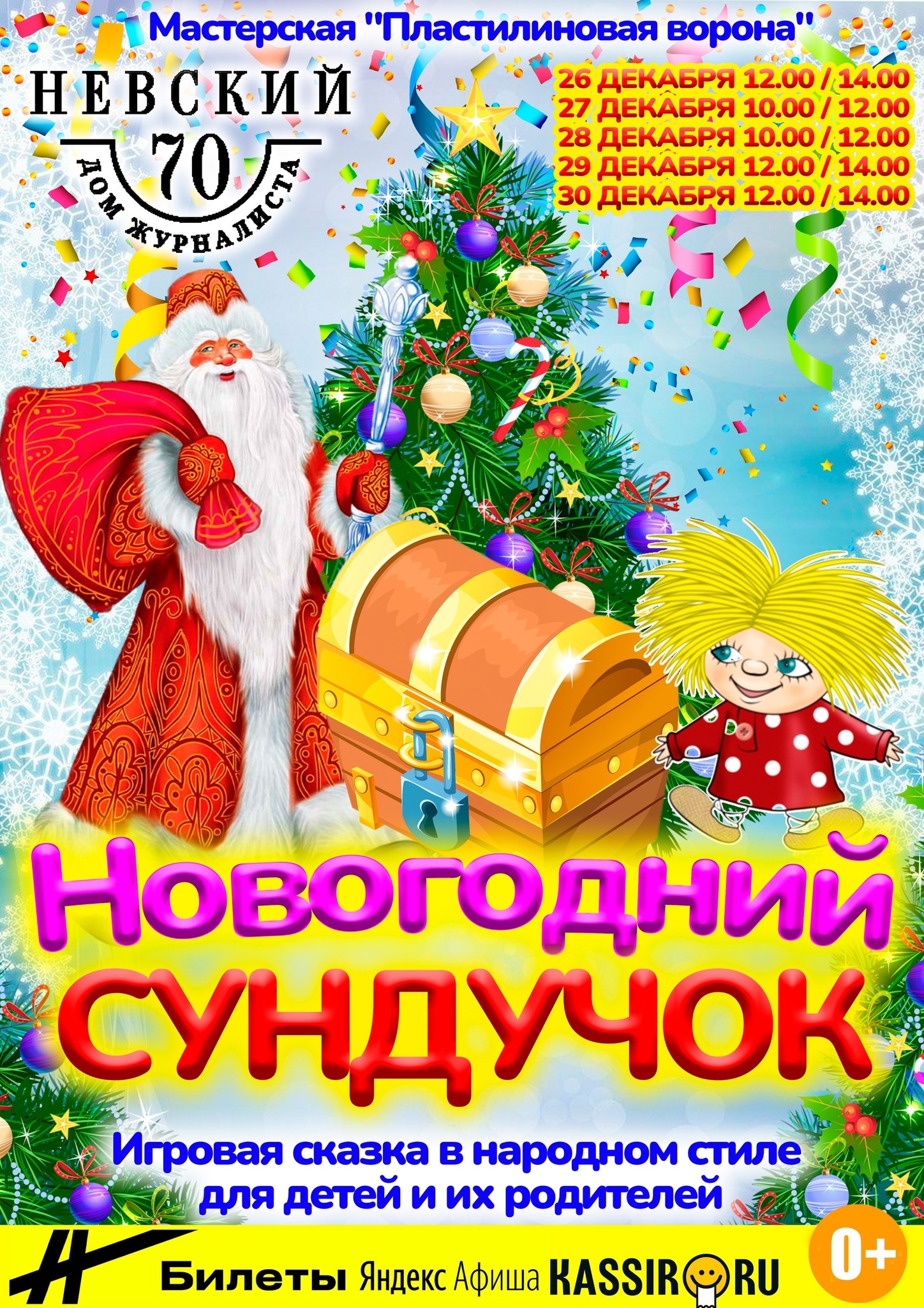 Продолжительность: 1 час 30 минут (45 минут – спектакль, 25 минут – интерактив, 15 минут – вручение подарков)