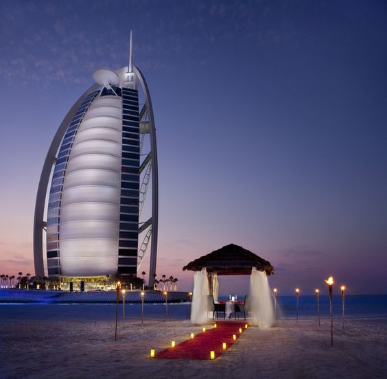 Если же завершить романтический уикенд вам хочется на пляже, на помощь приходит эксклюзивное предложение от Jumeirah Beach Hotel. Сначала влюбленную пару ждет поездка по городу на лимузине – роскошная прелюдия, которая задаст тон предвкушения чуда. По прибытии на курорт вас сопроводят в отдельный коттедж с выходом на пляж, откуда прекрасно виден знакомый силуэт Burj Al Arab Jumeirah и бескрайний Арабский залив.