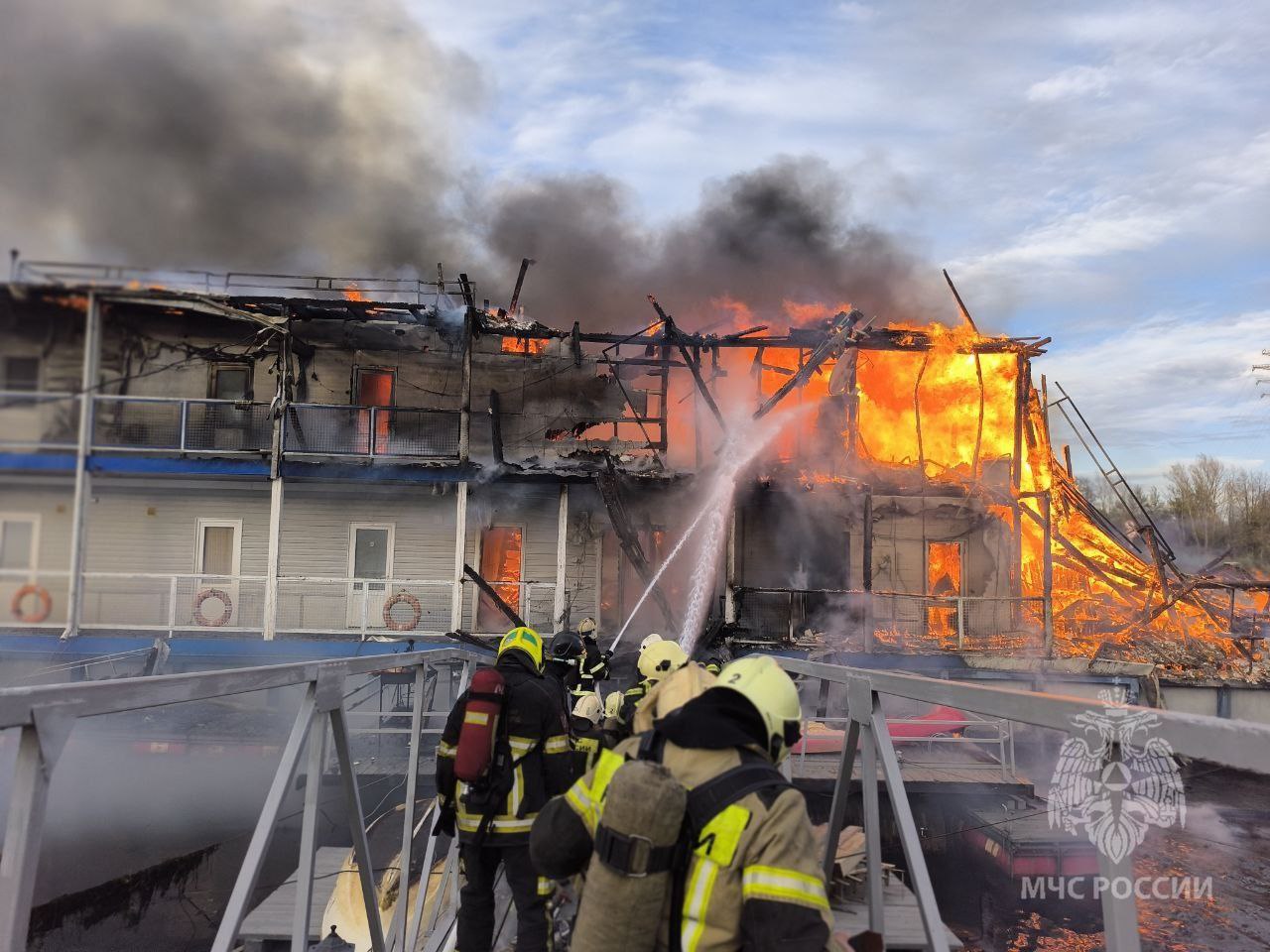 «В четвертом часу дня пожарные подразделения МЧС России выехали на тушение дебаркадера на набережной Гребного канала в Нижегородском районе областного центра. На момент прибытия подразделений происходило открытое горение строения, предположительно эксплуатируемого как гостиница… Тушение производится и с суши, и с реки», — сказано в сообщениях МЧС.