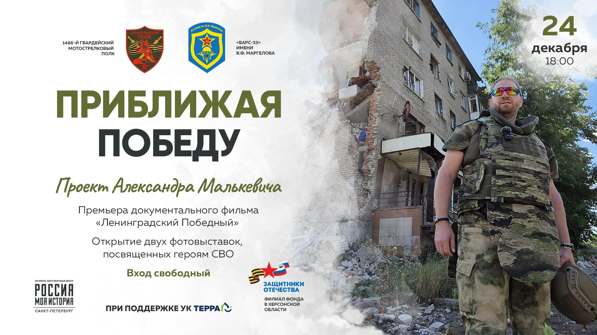 24 декабря 2024 года в 18.00 в музейно-выставочном центре «Россия – Моя история» пройдет мероприятие, посвященное героям, сражающимся в зоне специальной военной операции, в рамках которого состоится премьера полнометражного документального фильма Александра Малькевича «Ленинградский Победный», рассказывающего об истории Ленинградского гвардейского полка и его бойцах.