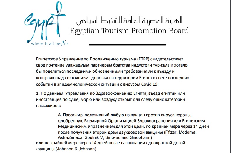 Египетское Управление по Продвижению туризма (ETPB) разослало российским туристическим компаниям циркуляр, в котором официально разъяснило правила въезда граждан РФ в Египет с 22 января 2022 года. Об этом «Вестнику АТОР» сообщили в Посольстве Египта в Москве и в пресс-службе туроператора «Интурист».