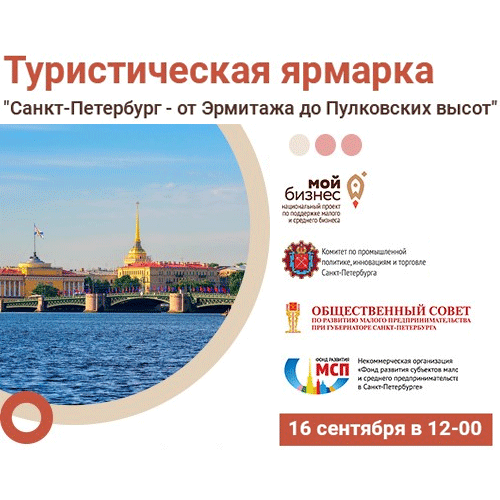 16 сентября 2020 года в 12.00 центр «Мой бизнес» проводит туристическую ярмарку "Санкт-Петербург - от Эрмитажа до Пулковских высот", которая состоится в онлайн-формате.