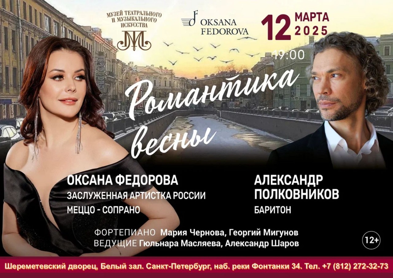 Вечер вокальных дуэтов в исполнении заслуженной артистки России, Мисс Вселенной Оксаны Федоровой и солиста Большого театра России Александра Полковникова пройдет в Белом зале Шереметевского дворца. 12 марта все любители вокальной музыки приглашаются на романтичный весенний концерт.