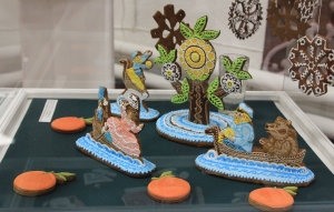 Козули могут быть как плоскостными, так и объемными. Впервые на выставке свою объемную пряничную композицию представила северодвинский мастер Оксана Мирошниченко. "У нее заглавная композиция по сказке "Апельсин", там очень красивое апельсиновое дерево", - уточнила Козлова. Кроме апельсинового дерева, в сценке показаны жители и гости Архангельска, плавающие по реке на лодках и другие персонажи.